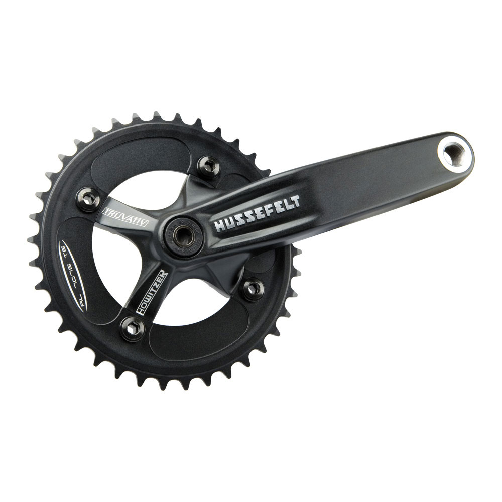 TruVativ's Hussefelt 1.1s are aggressive DH and freeride cranks forged from 6066 aluminum for superb stiffness and superior strength. The chromoly pedal inserts set the standard for burly pedal interfaces. Paired with TruVativ's oversize Howitzer bottom bracket (sold separately), these cranks laugh at the abuse you are sure to give them.
